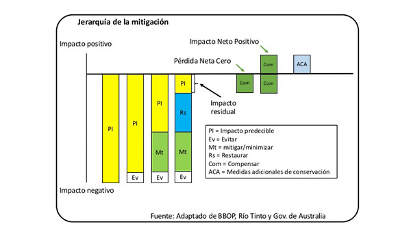 - Compensar: solo cuando las otras medidas de la jerarquía de mitigación no han podido ser implementadas, se pueden compensar los impactos residuales a través de la conservación de otras áreas equivalentes.