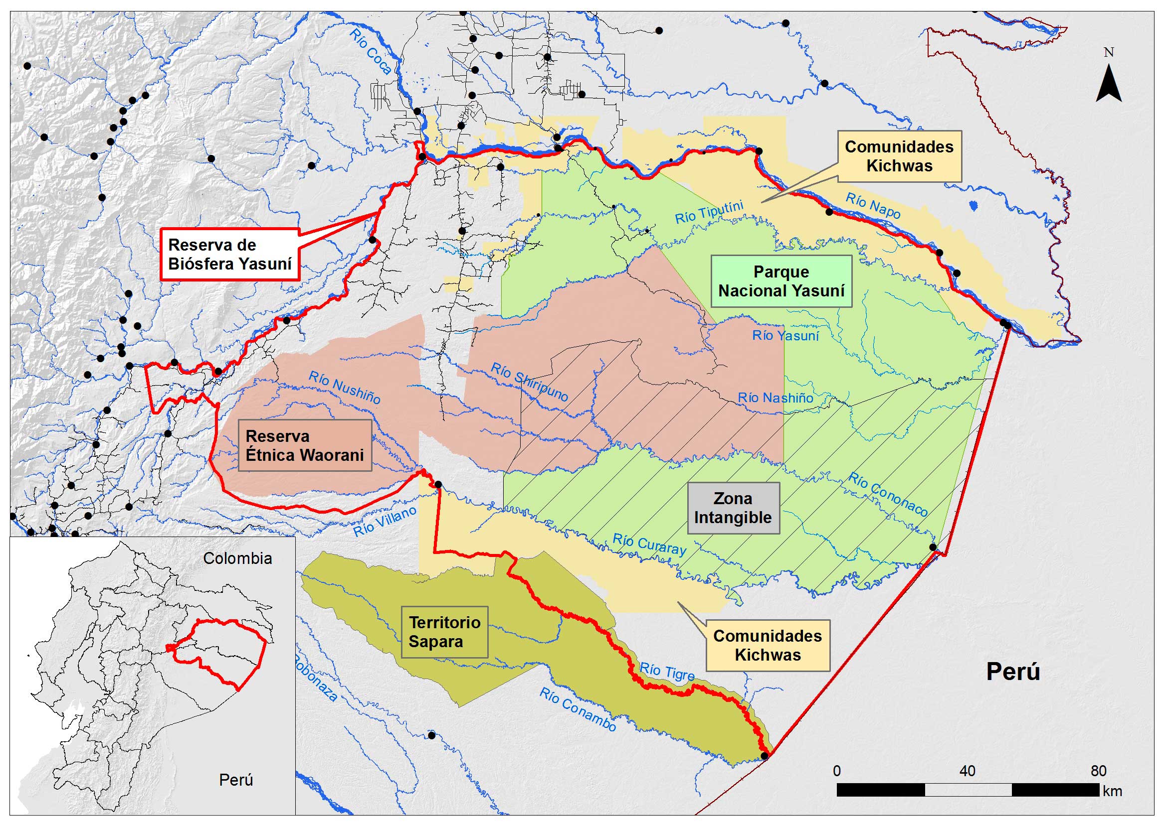 Las 2.7 millones de hectáreas de la Reserva de la Biósfera Yasuní (RBY), designada como reserva de la biósfera por la UNESCO en 1989, es uno de los sitios más ricos en biodiversidad del planeta y, también, uno de los últimos sitios de bosques tropicales inmaculados y continuos en el oriente ecuatoriano. La RBY está estratégicamente ubicada en la intersección de la Amazonía, los Andes y la línea ecuatorial. En su núcleo, la RBY contiene al Parque Nacional Yasuní (PNY) de un millón de hectáreas. Este bosque húmedo tropical es una de las joyas de biodiversidad del mundo, ya que contiene unas 1,300 especies de árboles, 610 especies de aves, más de 268 especies de peces y, por lo menos, 200 especies de mamíferos, incluyendo al tapir de tierras bajas (Tapirus terrestres), la huanguana (Tayassu pecari), el jaguar (Panthera onca), el perro venadero (Speothos venaticus), el perro de monte o de orejas cortas (Atelocynus microtis) y 13 especies de primates.