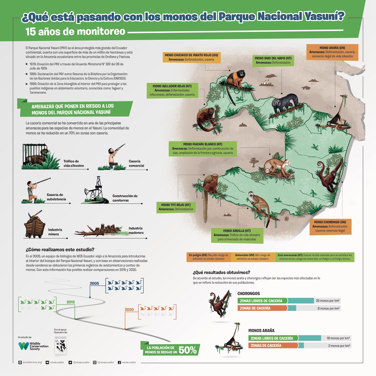 Desde el 2005, WCS Ecuador ha levantado información en campo sobre mamíferos del Parque Nacional Yasuní, con el propósito de evaluar cambios poblacionales de estas especies. Tras quince años de este estudio y en comparación a una línea base, la investigación ha logrado establecer que la comunidad de primates se ha reducido en un 70% en zonas de cacería., adicionalmente, las poblaciones de monos se han reducido en un 51% desde el 2005.