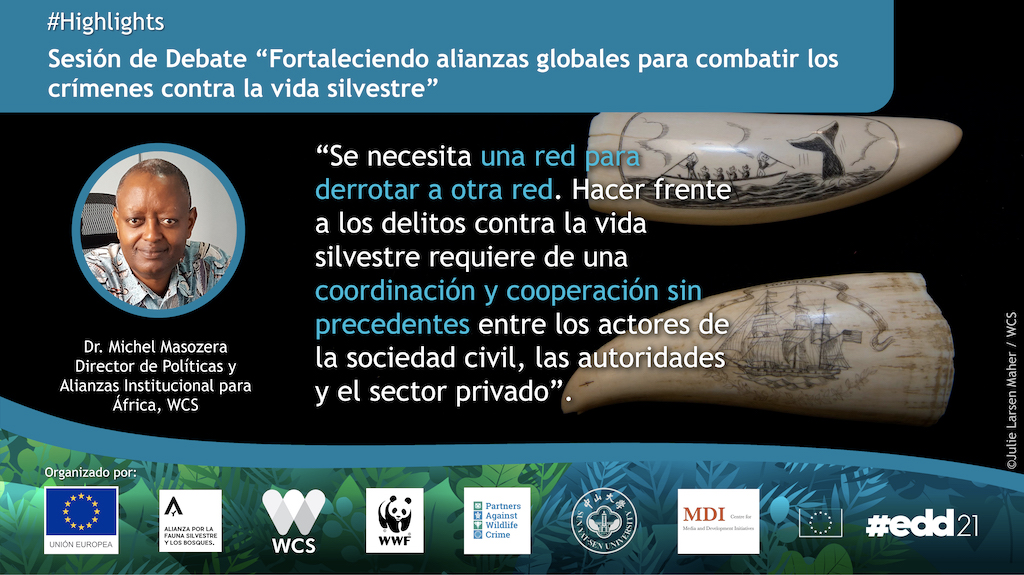 El Dr. Michel Masozera, Director de Políticas y Alianzas Institucionales para África de WCS, resaltó la necesidad de una mayor coordinación y cooperación de los distintos sectores para combatir el tráfico de especies silvestres. Destacó la urgencia de hacer frente a la corrupción y a la falta de una buena gobernanza, señalando que en ningún lugar la corrupción es más generalizada, transcontinental y sistemática que en el sector de los recursos naturales en África, lo cual conlleva a la pérdida de ingresos directos, puestos de trabajo, paz y seguridad.