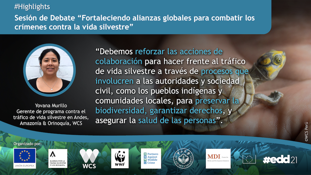 Estas premisas fueron resaltadas durante la sesión de debate “Fortaleciendo alianzas globales para combatir los crímenes contra la vida silvestre”, realizada el 16 de junio durante los European Development Days (Días de Desarrollo Europeo). Esta sesión fue co-organizada por la "Alianza por la Fauna Silvestre y los Bosques", acción regional liderada por Wildlife Conservation Society (WCS) y World Wildlife Fund (WWF), y Partners Against Wildlife Crime, coordinada por WCS con aliados de la región de Asia, siendo ambas iniciativas financiadas por la Unión Europea. Panelistas de WCS, la Universidad Sun Yat-Sen de China y el Centro de Medios de Comunicación e Iniciativas de Desarrollo (MDI) de Vietnam expusieron sobre los desafíos y estudios de casos de las acciones frente al tráfico de vida silvestre en Latinoamérica, principalmente Amazonía, y en Asia.