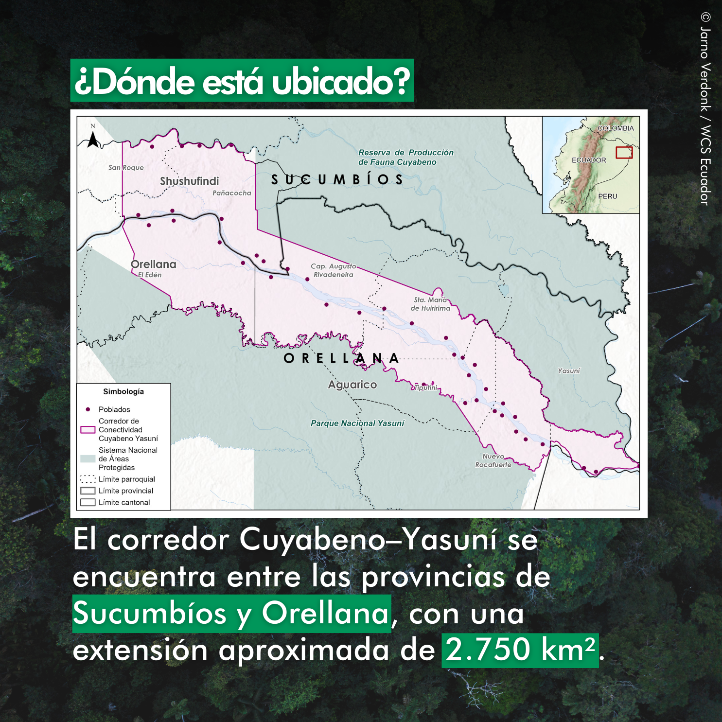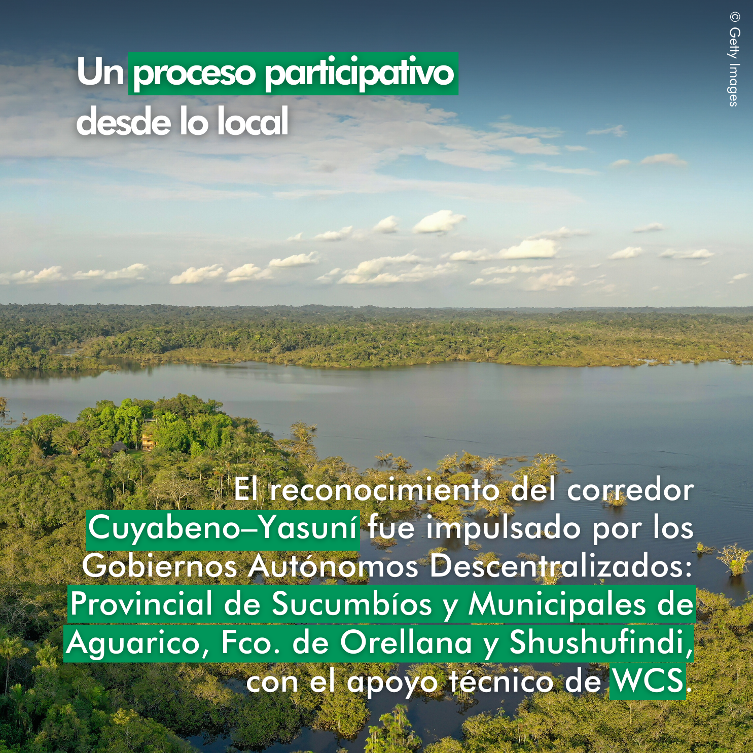 El Corredor de Conectividad Cuyabeno–Yasuní conecta la Reserva de Producción Faunística Cuyabeno con el Parque Nacional Yasuní. Cuatro gobiernos autónomos descentralizados conforman el grupo promotor que impulsó su reconocimiento ante la Autoridad Nacional Ambiental, con el respaldo técnico de Wildlife Conservation Society (WCS).